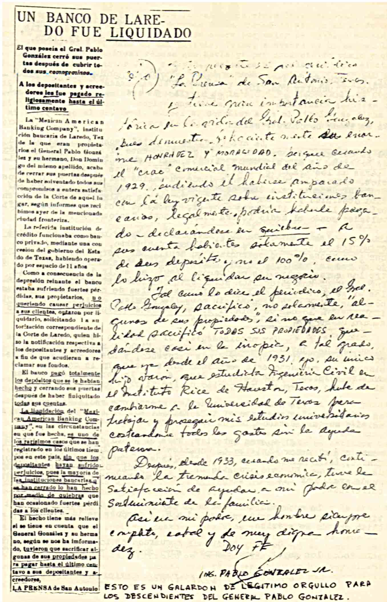 Artículo de "La Prensa de San Antonio" que demuestra la honradez y moralidad del Gral. Pablo González, quien pagara el 100% del dinero a sus cuenta habientes pudiendo haber pagado solo el 15% legalmente cuando el "Crac" de 1929.